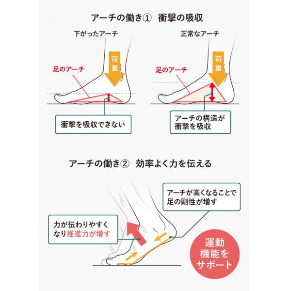 アーチの主な働きは、スポーツに重要な衝撃吸収と骨格剛性を高め、力を伝えやすくすることです。