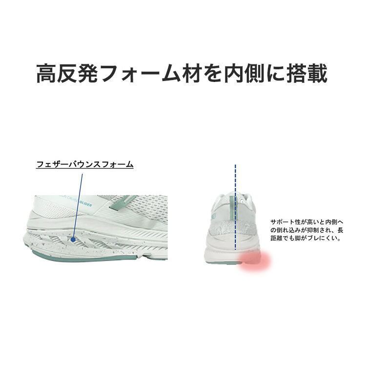 最大の特徴は、ソール内部に搭載した弊社独自の衝撃吸収反発素材「パワークッションRプラス」。高いクッション性が走行時の衝撃を和らげ、ひざへの負担を軽減するとともに、優れた反発性で弾むような走行感を実現します。