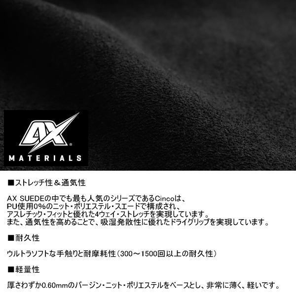 AX SUEDEの中でも最も人気のシリーズであるCincoは、PU使用0%のニット・ポリエステル・スエードで構成され、アスレチック・フィットと優れた4ウェイ・ストレッチを実現しています。また、通気性を高めることで、吸湿発散性に優れたドライグリップを実現しています。