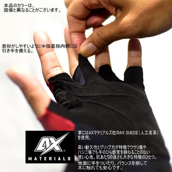 掌にはAXマテリアルズ社のAX SUEDE(人工皮革)を使用。高い耐久性とグリップ力が特徴でクサリ場やハシゴ場でも手のひら感覚を損ねることのない使い心地。肌あたりの良さも大きな特徴のひとつ。