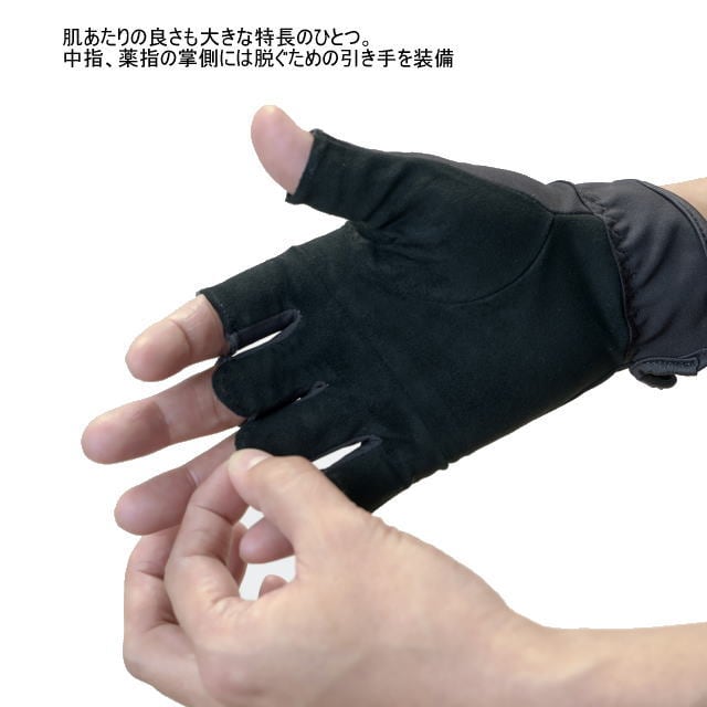 肌あたりの良さも大きな特長のひとつ。中指、薬指の掌側には脱ぐための引き手を装備。
