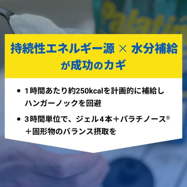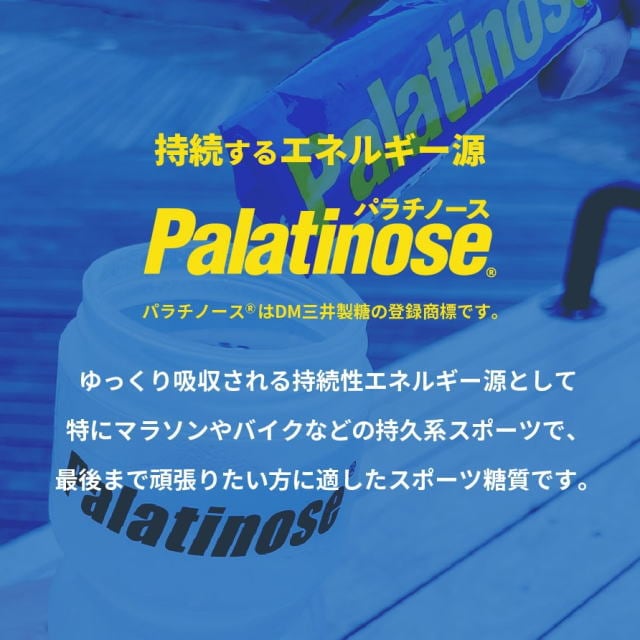 世界に先駆け、日本で最初に食品用途で発売された、ゆっくり吸収される性質を持つ、天然由来のエネルギー源。高純度パラチノースのスティックタイプです。小腸全体でゆっくり吸収されるので、 特にマラソンやトライアスロンなど持久系のスポーツなどに、おすすめの糖質です。