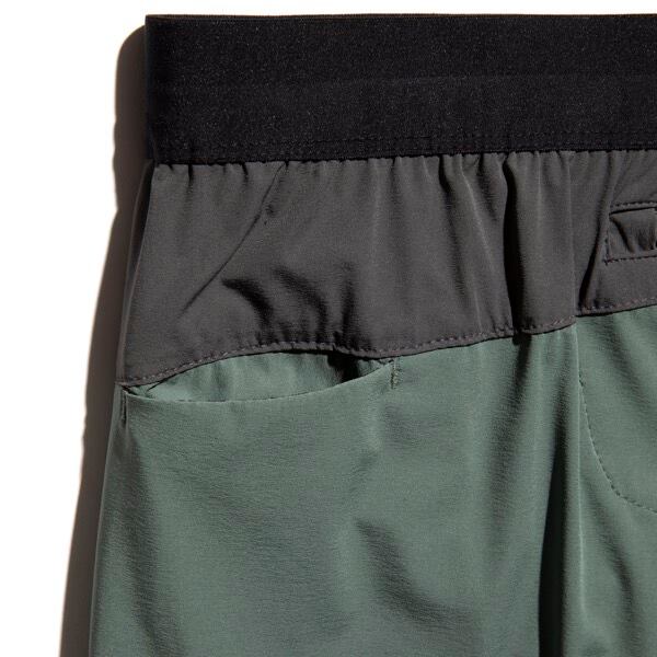 再生ポリエステル製の軽量4WAYストレッチ素材RepreveRに、DWR(耐久性撥水)加工を施しています。両サイドにスラッシュポケットを、バックにはZIPポケットと通気孔も備えています。