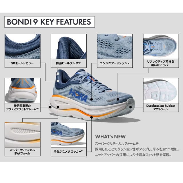 HOKAラインナップの中で人気の高いボンダイシリーズから、隅々まで一新されたボンダイ9(BONDI 9)が登場。