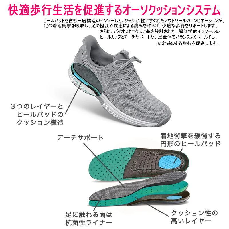 クッション性とサポート力に優れた独自開発のインソールは、足をしっかり支えながら着地衝撃を吸収し、負荷を軽減。アウトソールとの組み合わせによる「オーソクッションシステム」により、快適な履き心地と歩行を提供します。