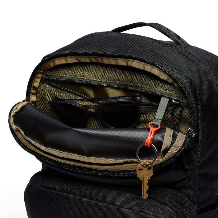 フロントにボックス型のジッパーポケット2つ、トップのフロントポケットの内側にキークリップを備えたメッシュ素材のジッパーポケット