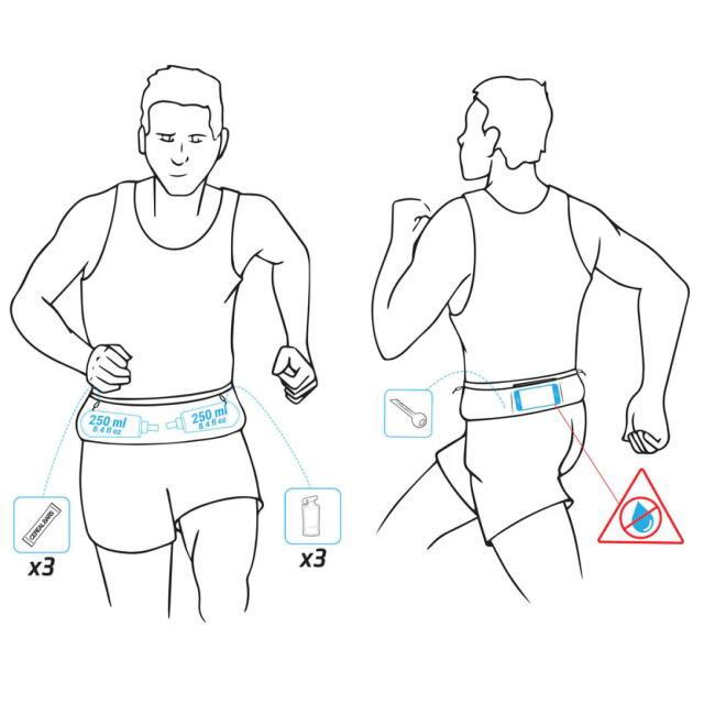 腹部にソフトボトル2本(最大250ml)、臀部に6本のジェルを分けて入れて持ち運べるようにベルトをデザインしました。緊急性の低いものは背面のポケットに入れておきましょう。例えば、電話や鍵を入れておけば、湿気(汗や雨)から守れます。もっと入れることもできますが、固定力が弱くなって揺れが激しくなる恐れがあります。