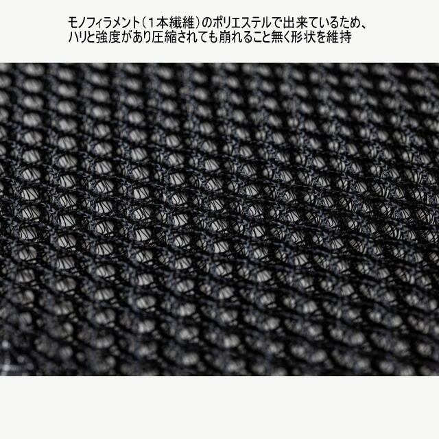 ・エアメッシュパッドは、モノフィラメント(1本繊維)のポリエステルで出来ているため、ハリと強度があり圧縮されても崩れること無く形状を維持