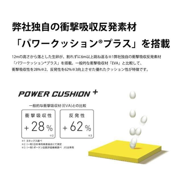 本製品には、独自の衝撃吸収反発素材「パワークッションRプラス」をソール内部に搭載しています。高いクッション性が衝撃を和らげ、ひざへの負担を軽減するとともに、優れた反発性で弾むような走行感を実現します。