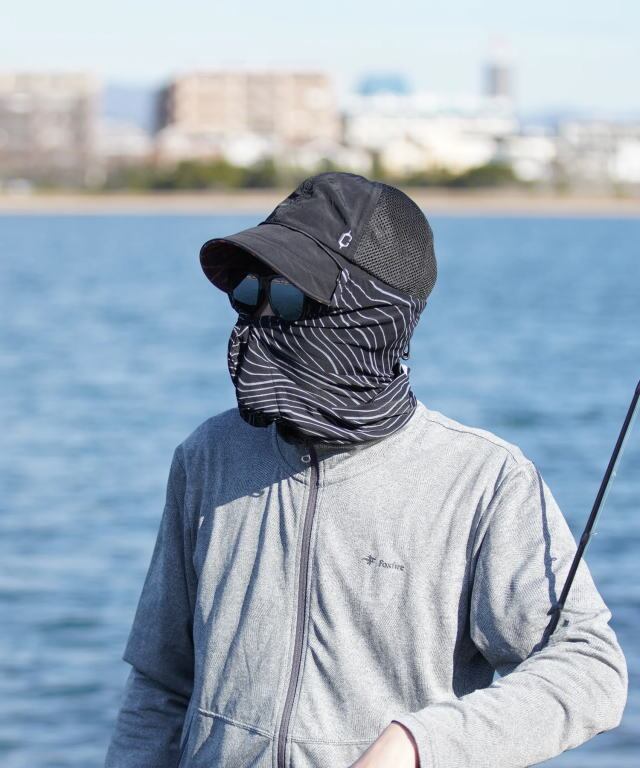 通気性重視で後頭部のみのランニングスタイルから、顔の正面でボタンを留めるフェイスガードスタイルにして日差しや虫などを防ぐ使い方が可能。