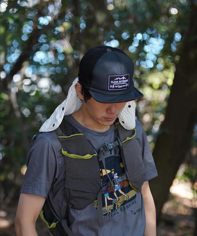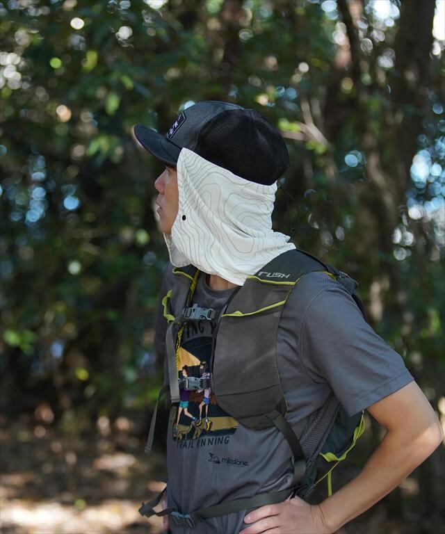 通気性重視で後頭部のみのランニングスタイルから、顔の正面でボタンを留めるフェイスガードスタイルにして日差しや虫などを防ぐ使い方が可能。