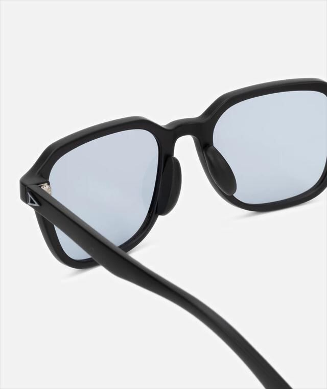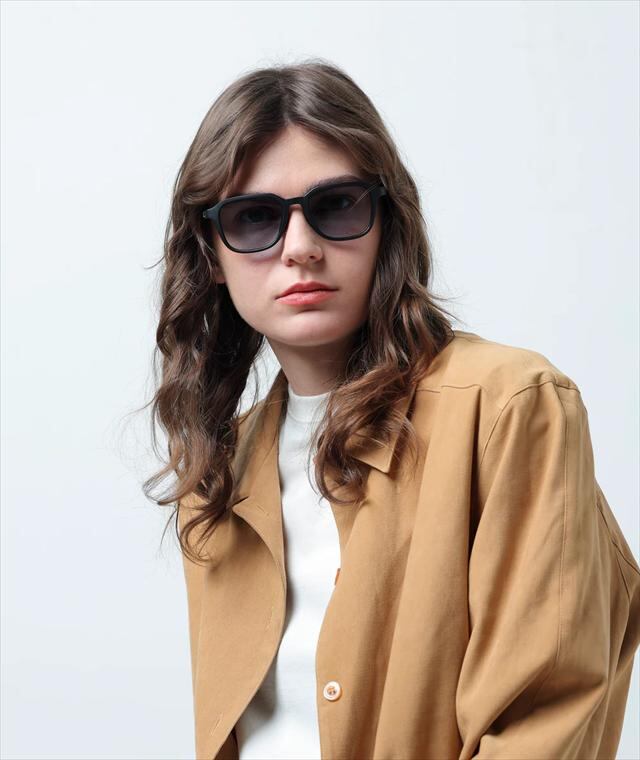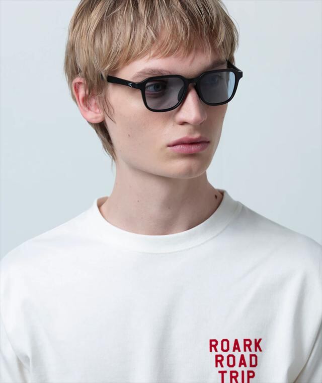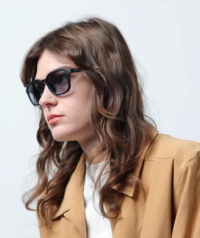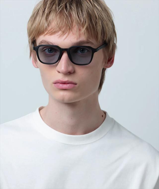 ビンテージをモチーフにしたスクエアフレームが個性を感じさせつつ、あくまでもさりげなく自然な顔馴染みになるようバランスを整えています。テンプルも新開発のナロータイプを組み合わせる事で全体としてスッキリとした印象にまとめられており、程よいアクセントを生み出しています。フレームはマットブラック、レンズは眩しさを抑えつつ目元を彩るライトブルー。
