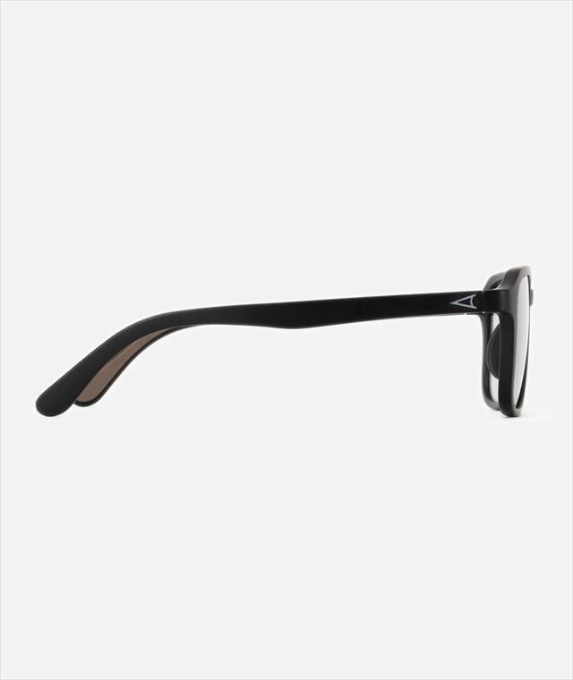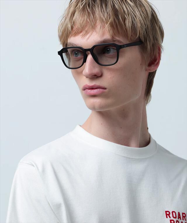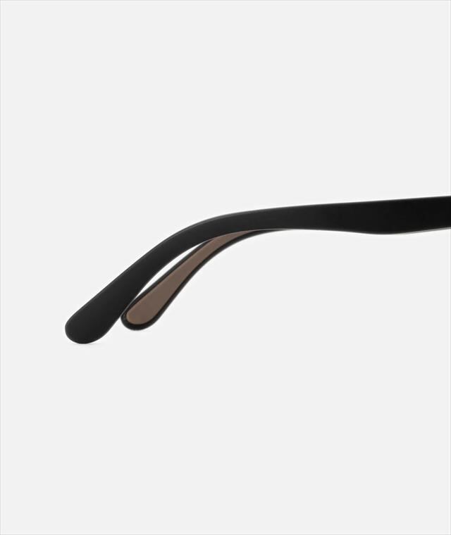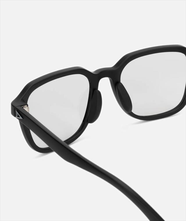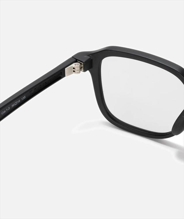 ビンテージをモチーフにしたスクエアフレームが個性を感じさせつつ、あくまでもさりげなく自然な顔馴染みになるようバランスを整えています。テンプルも新開発のナロータイプを組み合わせる事で全体としてスッキリとした印象にまとめられており、程よいアクセントを生み出しています。フレームはマットブラック、レンズは紫外線量により明るさが変わる調光レンズ。