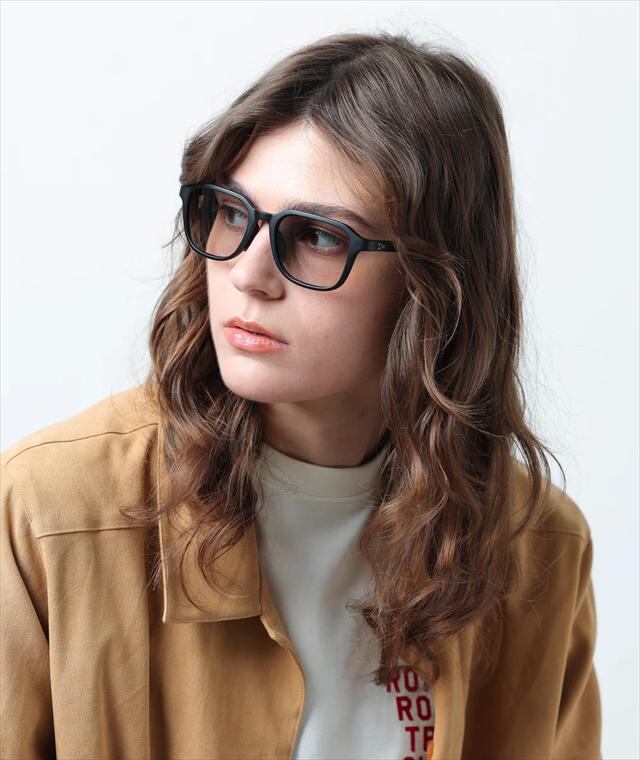 ビンテージをモチーフにしたスクエアフレームが個性を感じさせつつ、あくまでもさりげなく自然な顔馴染みになるようバランスを整えています。