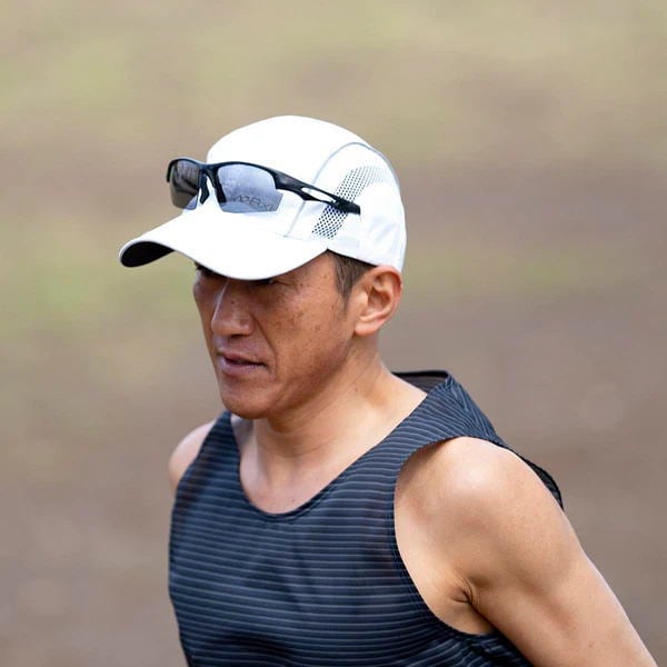 キャップのいちばんの役割である直射日光を大きなツバでカットし、日差しを目から守るサングラス用のホルダーを設置したランニングキャップ